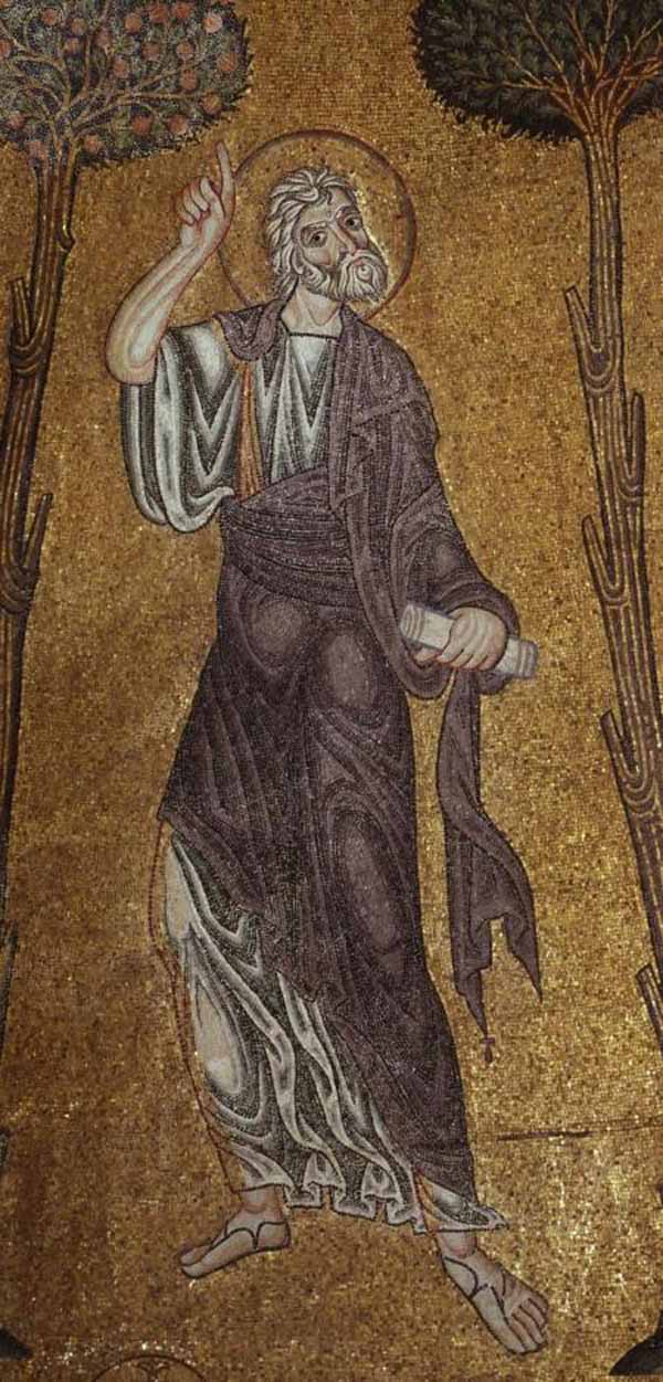 - со свитком в руке, например на мозаиках нартекса Осиос Лукас в Фокиде (Греция), 30-е гг. XII в.№ - - с крестом на длинном древке, например на мозаике апсиды ц. Санта-Мария Ассунта в Торчелло, ок. 1130 г.; на мозаике капеллы дель Сакраменто собора в Триесте, 1-я пол. XII в.; на мозаике кафедрального собора в Чефалу в Сицилии, ок. 1148 г.